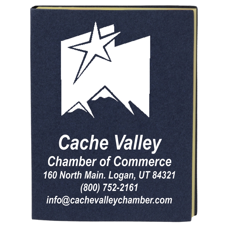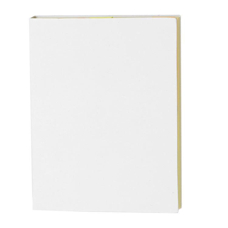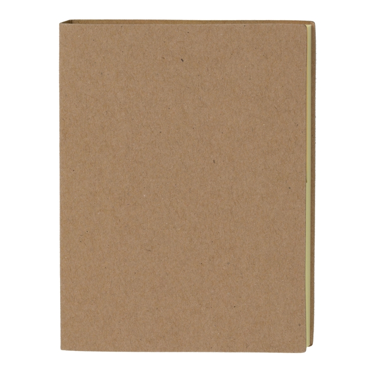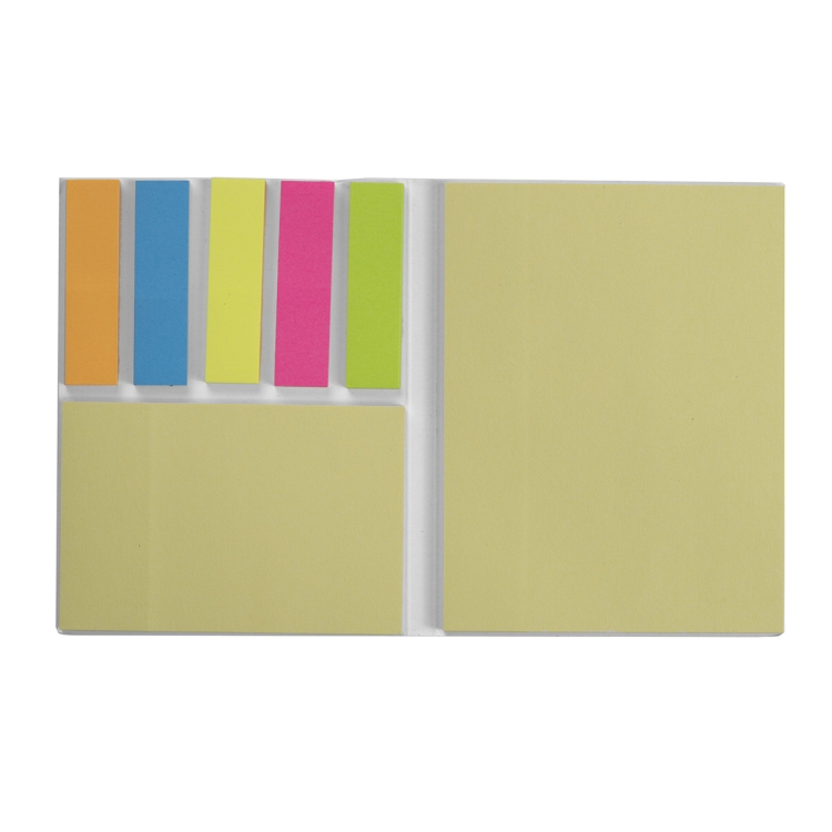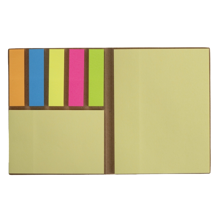 Features a cover made of colored paper products. Includes 30 sheets of large yellow sticky notes, 25 sheets of small yellow sticky notes and 25 each of 5 vibrant colors of sticky note flags in one note pad notebook.
