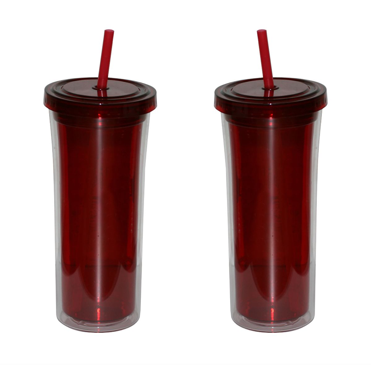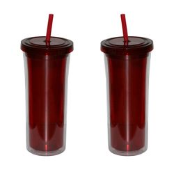 Holds 16 ounces, BPA free Acrylic double wall construction with threaded lid and tapered bottom that fits most drink holders. Recyclable and Reusable. Includes matching straw.