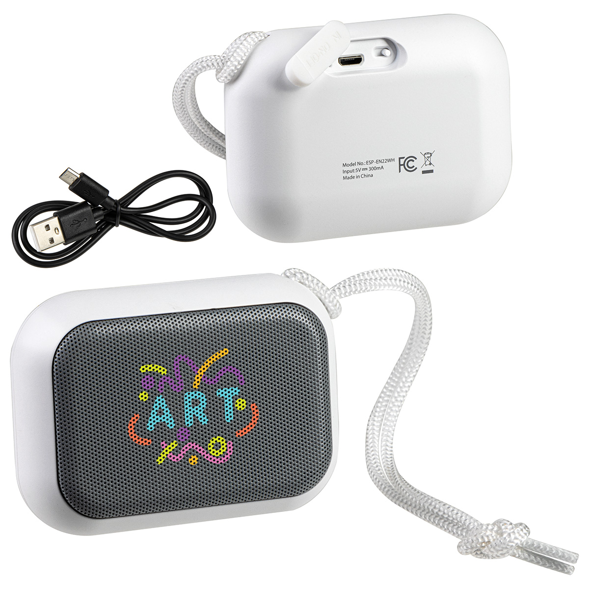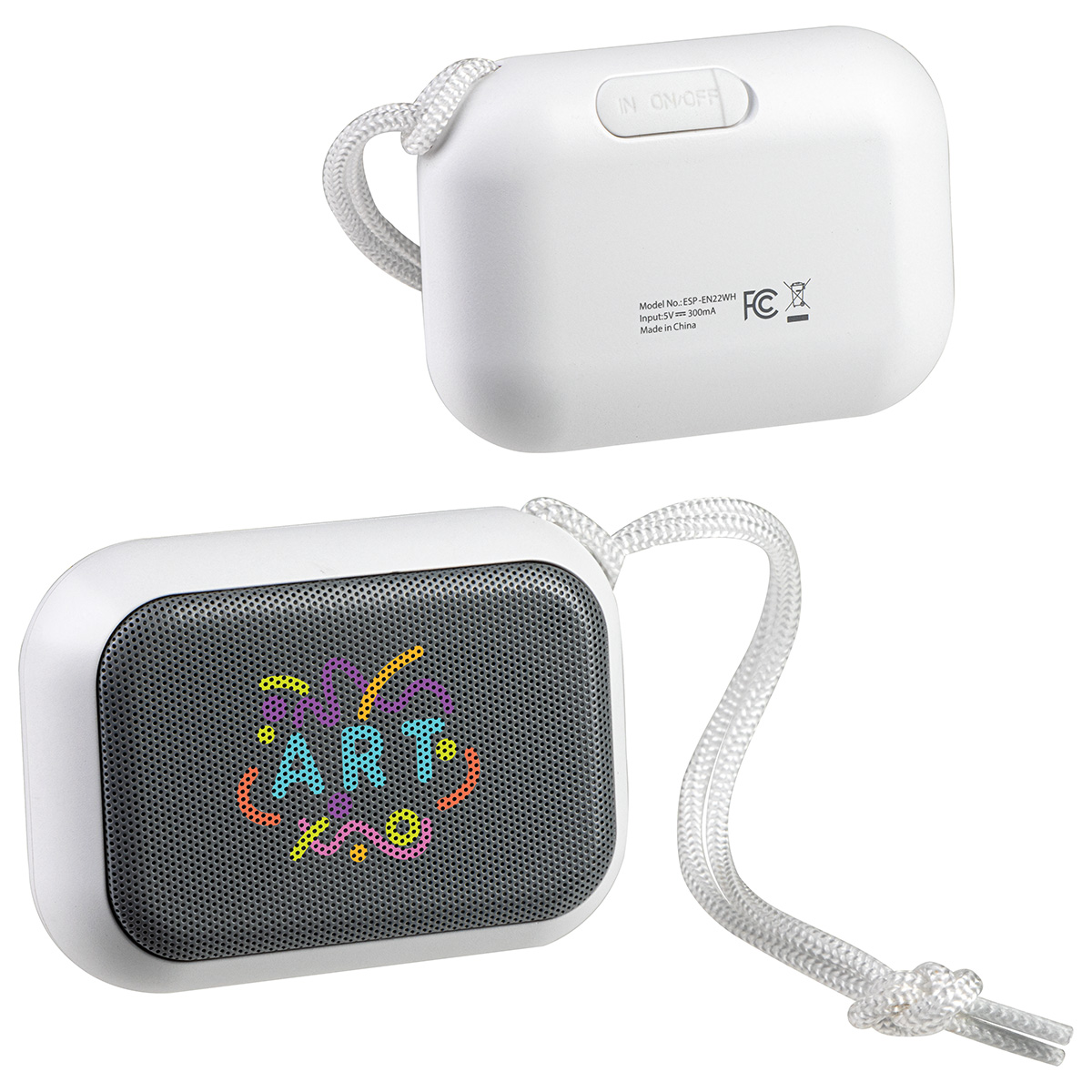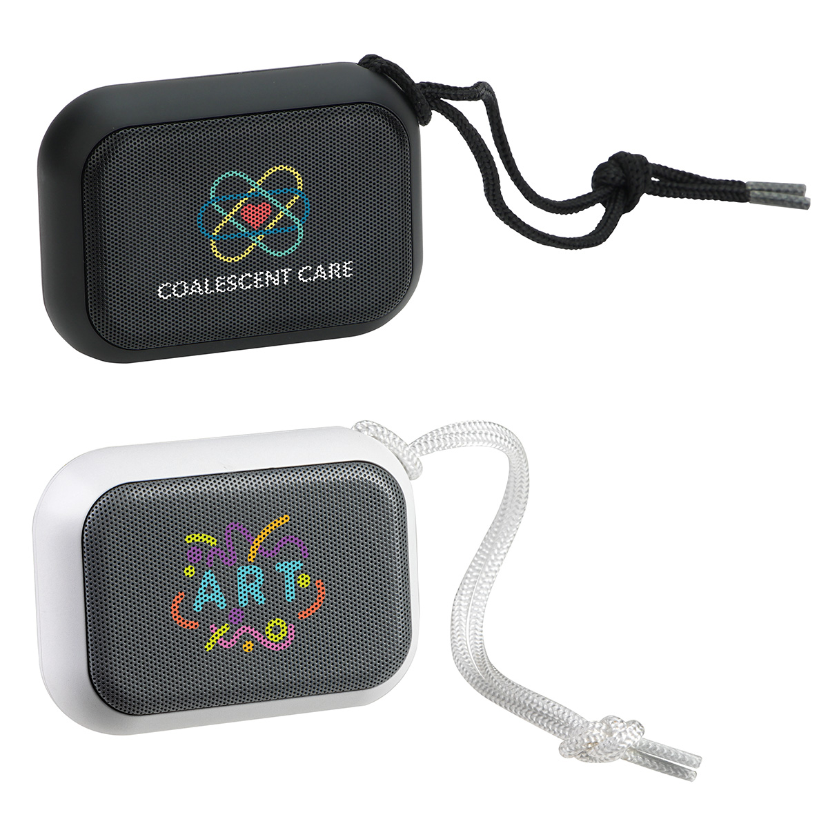 Encore IPX6 Waterproof Wireless Speaker is a 3W speaker with braided rope lanyard and has IPX6 Waterproof (can resist high pressures of water, cannot be submerged). This speaker is easy to use and offers full-color decoration on the front speaker grill. Playing Time: 3 hours | Charging Time: 1.5 hours. Connection range up to 33 feet. Includes charging cable. Note: Font size needs to be at least 16 pt for digital print on front speaker grill.