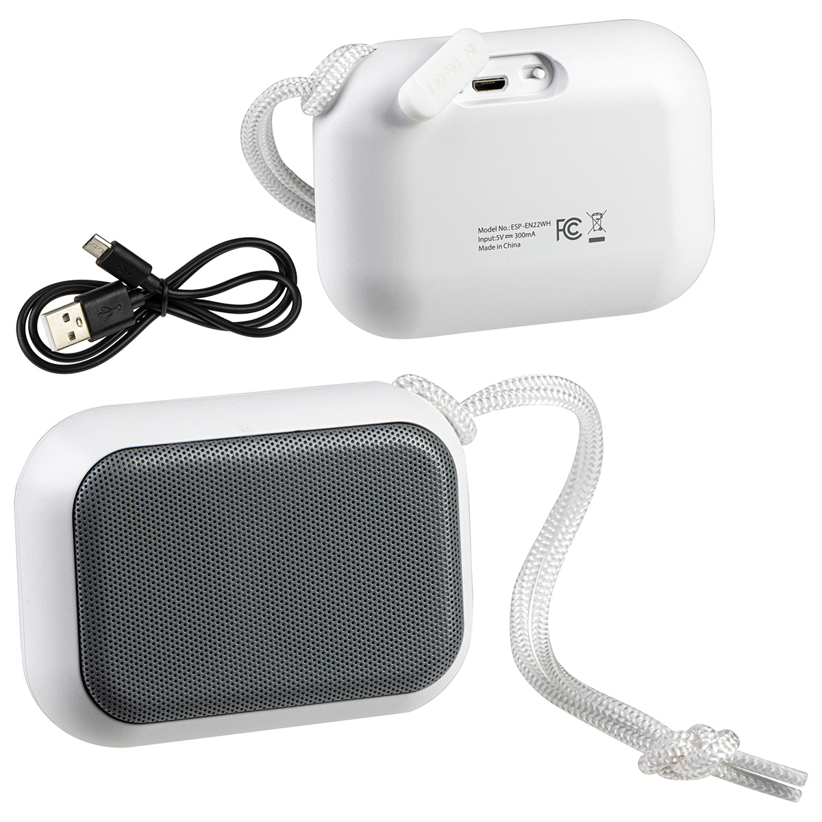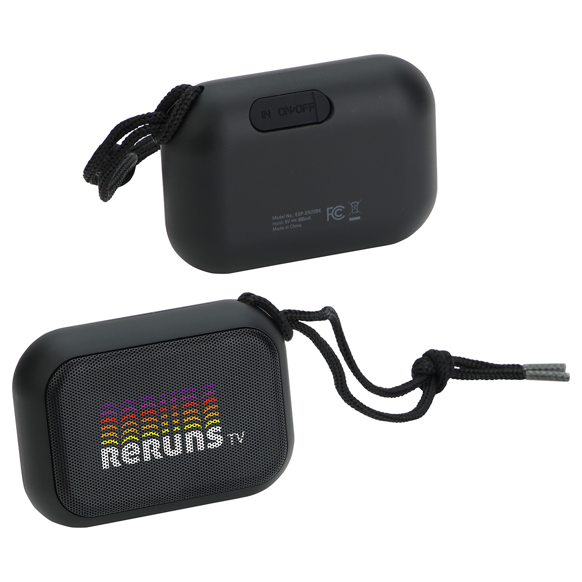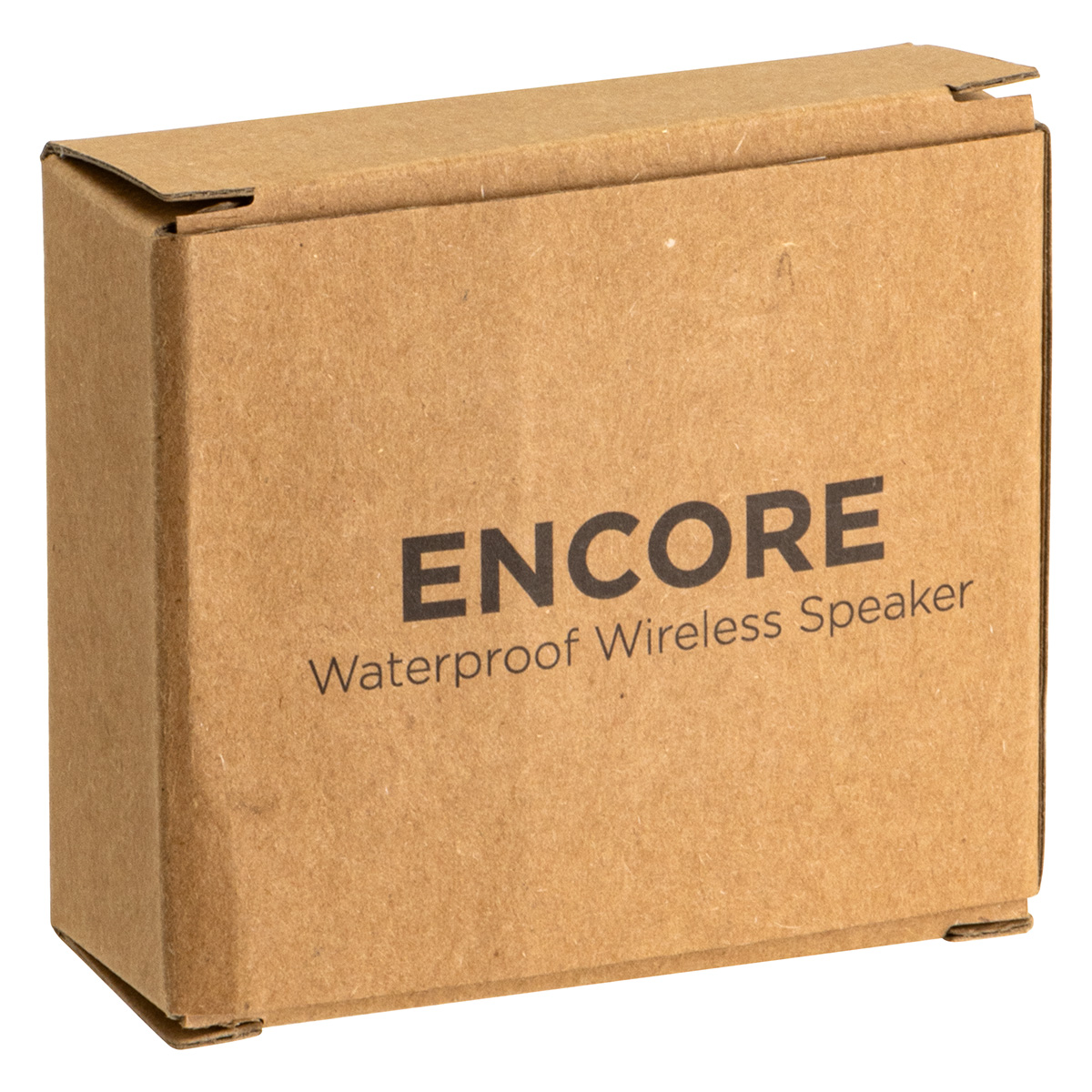 Encore IPX6 Waterproof Wireless Speaker is a 3W speaker with braided rope lanyard and has IPX6 Waterproof (can resist high pressures of water, cannot be submerged). This speaker is easy to use and offers full-color decoration on the front speaker grill. Playing Time: 3 hours | Charging Time: 1.5 hours. Connection range up to 33 feet. Includes charging cable. Note: Font size needs to be at least 16 pt for digital print on front speaker grill.