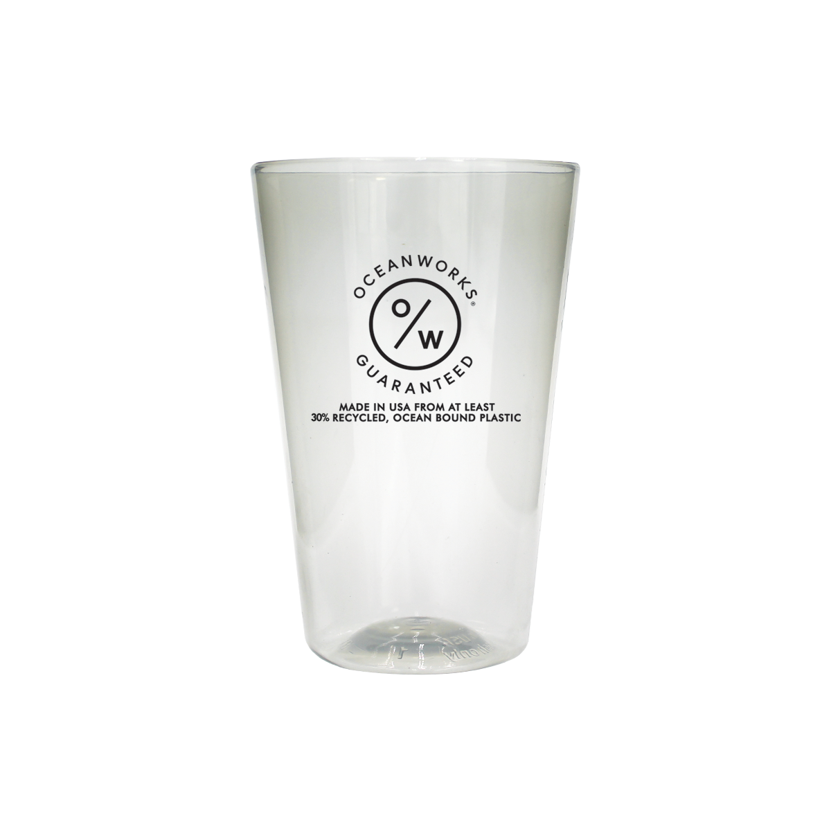 Made in USA from 30% recycled, Ocean Bound Plastic. Ocean Bound Plastic is material collected from communities with no formal waste management within 50 km of the shoreline. The plastic used to make the pint glass comes from OCEANWORKS - A trusted global marketplace for recycled ocean plastic materials and products. Shatterproof plastic. Reusable. Hand wash only. BPA Free. Clear will have a gray hue due to recycled content.