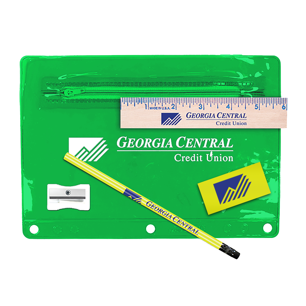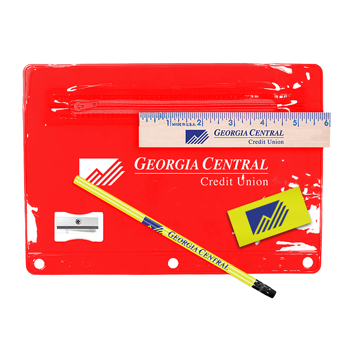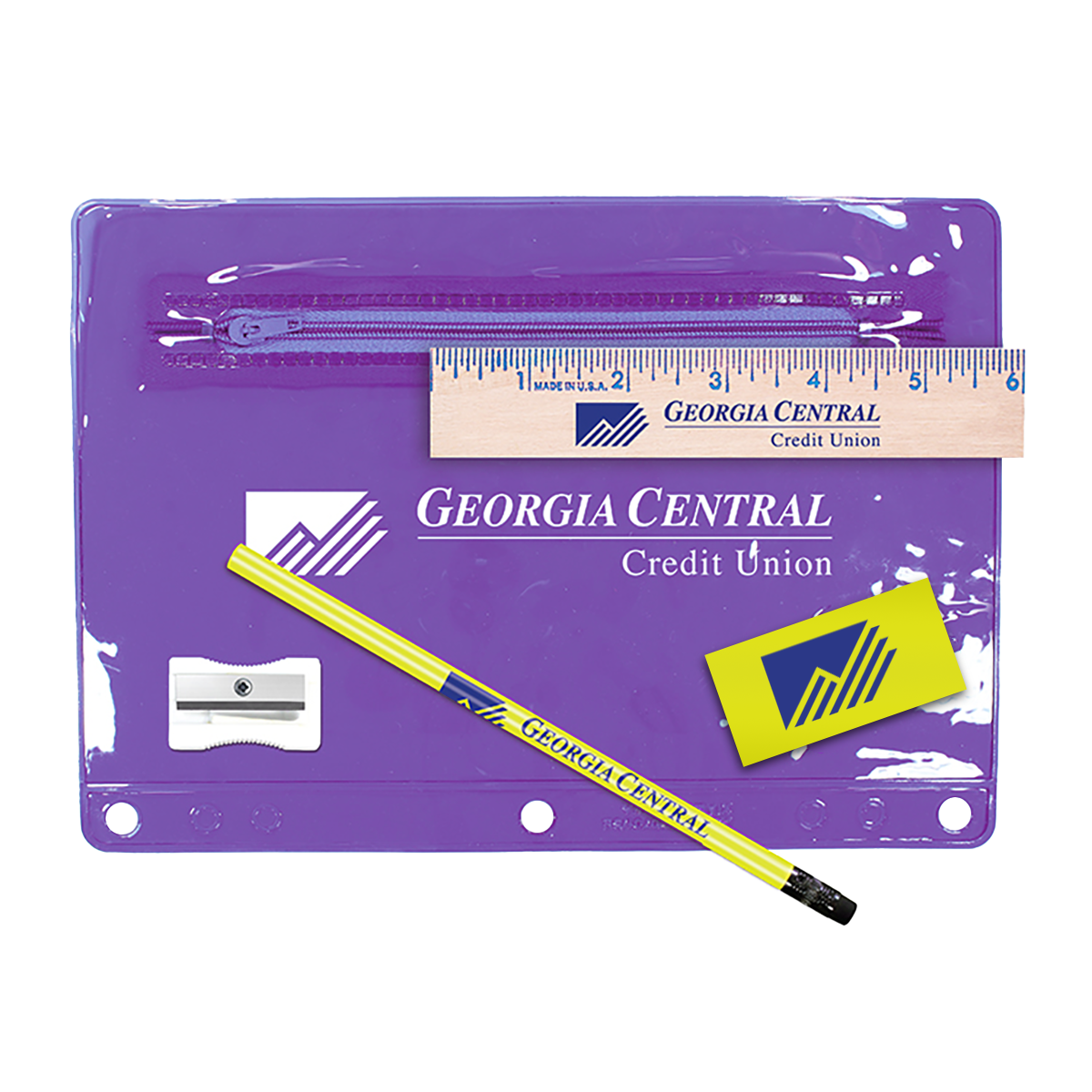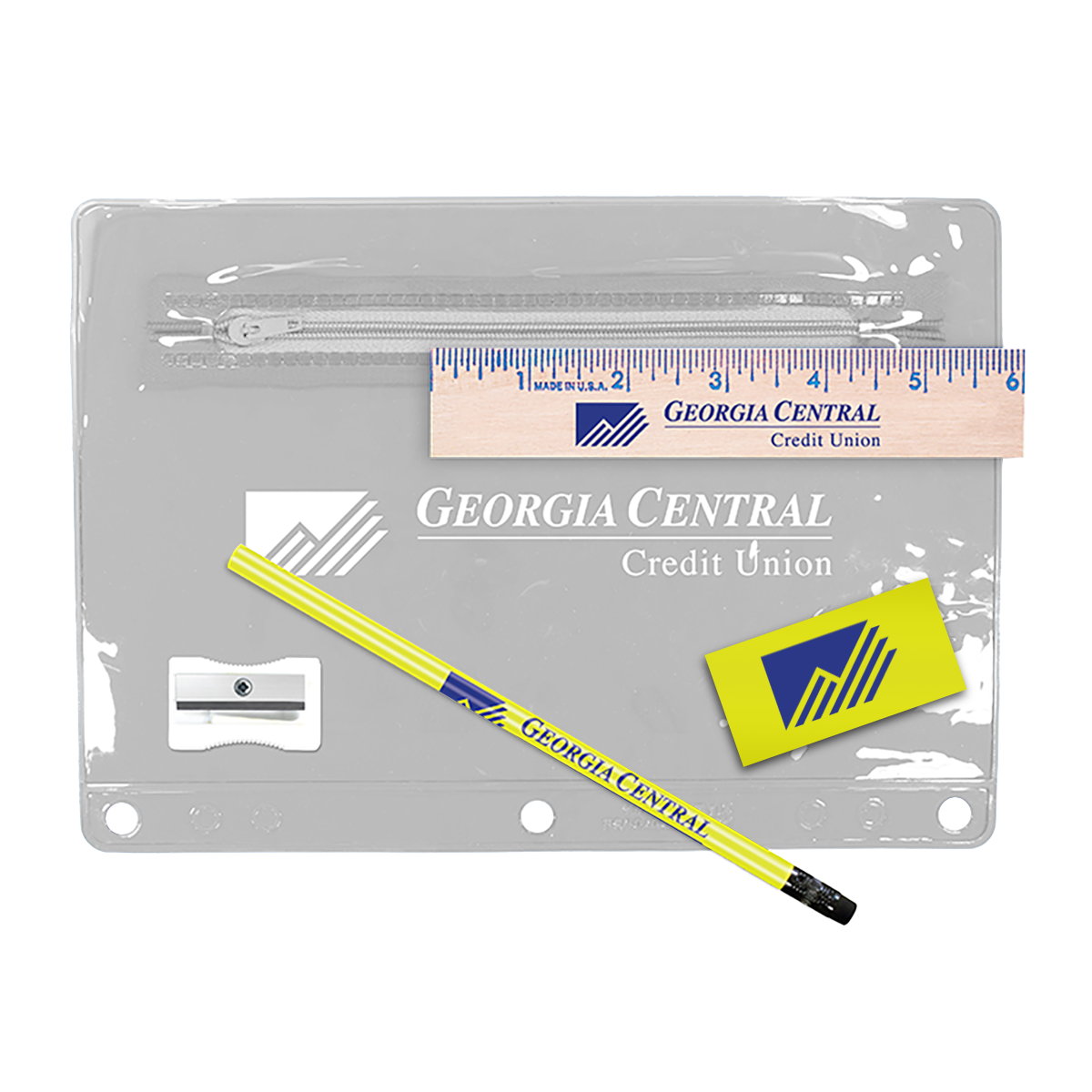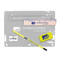 Pricing Includes:a one-side, one-color imprint on all items (except sharpener). For custom logo on ruler, add $35.00 (G) per 3", per color. All items are inserted into an imprinted vinyl, zippered packet. For any additional charges, other than listed, see specific page for the individual item.