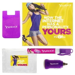 Our On the Go Tech Kit contains highly desirable items that your audience will be eager to use. Each of these items were selected with mobility in mind, as this kit fits easily into most briefcases, handbags and suitcases. Ideal for corporate gifts, employee incentives, new business openings and more. The set up charge includes a full color imprint on the USB Car Charger, Computer Screen Cleaner with 6 x 7 Microfiber Cloth, a one color imprint on the Smart Wallet & a full color label on the bag.