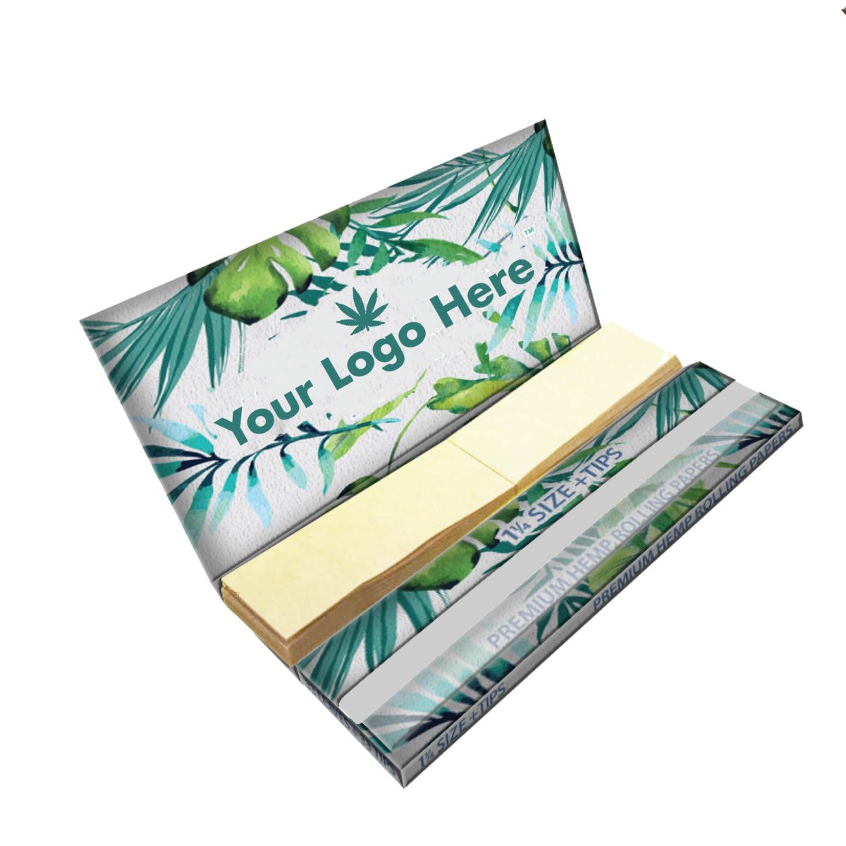 These custom 1 1/4 size rolling paper booklets with tips or crutches, can be completely custom branded on the inside and outside. Hemp, rice or bleached and unbleached wood pulp rolling papers available.