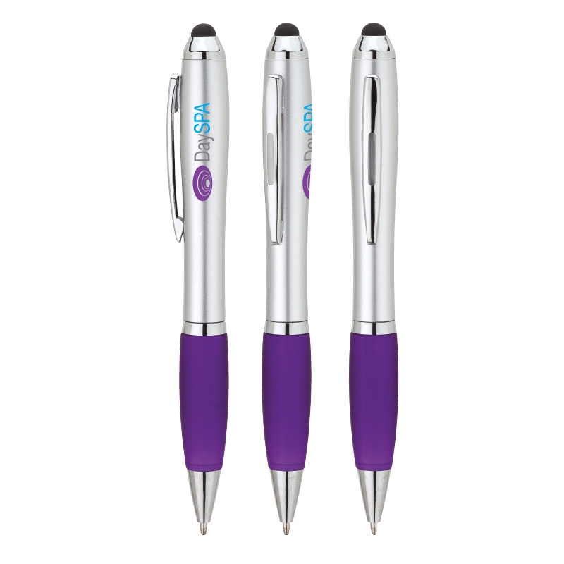 This twist-action ballpoint features an hourglass-shaped barrel with colored rubberized grip, metal clip,chrome trims and capacitive stylus that works with touch screen devices.