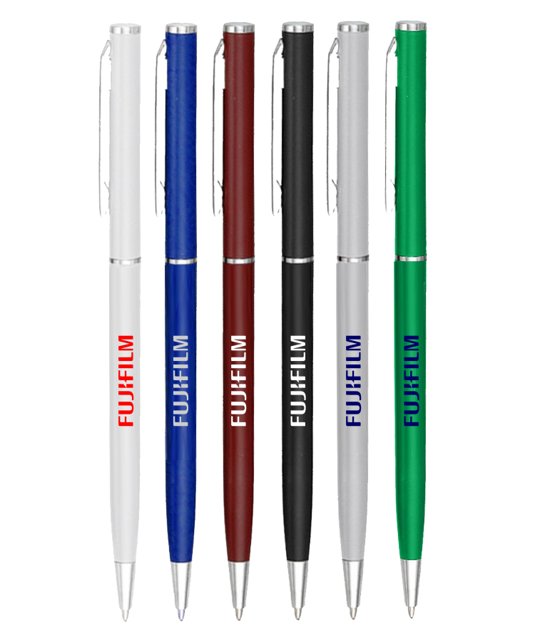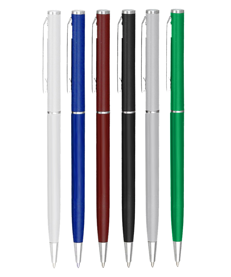A slim, metal look plastic pen with a twist-action mechanism.