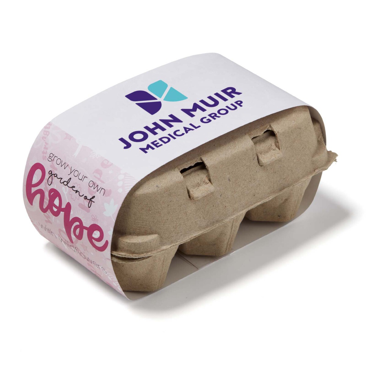 Grow-Your-Own Garden of Hope kit contains 3 packages of seeds and starter soil, plus wooden plant stakes, all inside a recycled 6 count egg carton! Write on the wooden stakes, to identify the seed type in each compartment! Use our stock design belly band and add your logo for a fantastic representation of your brand or create your own with our custom option. Seeds include: Sunflowers, Poppies, and Impatients.
