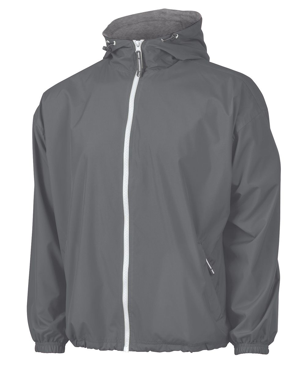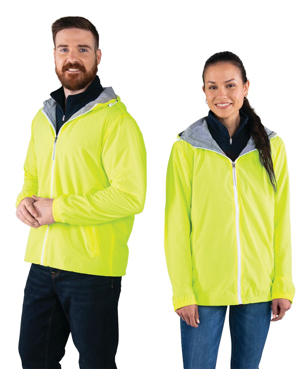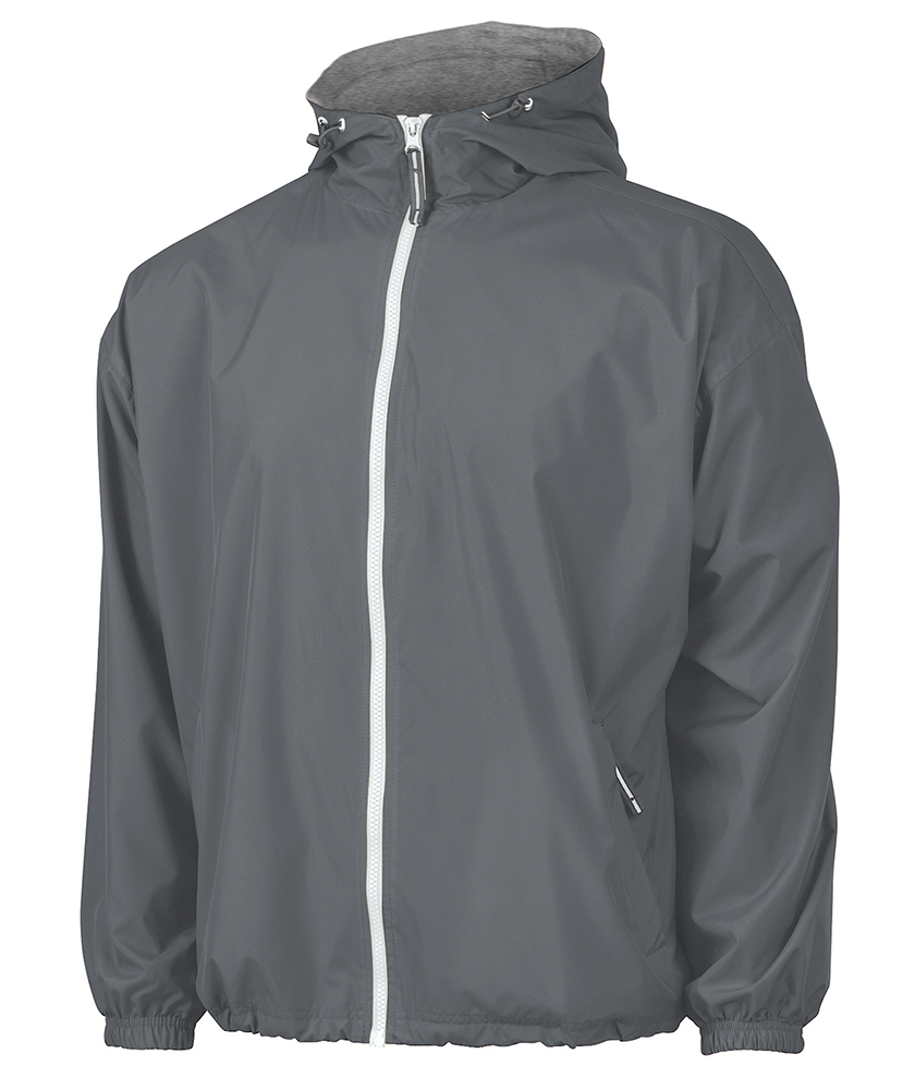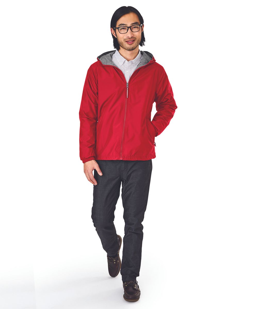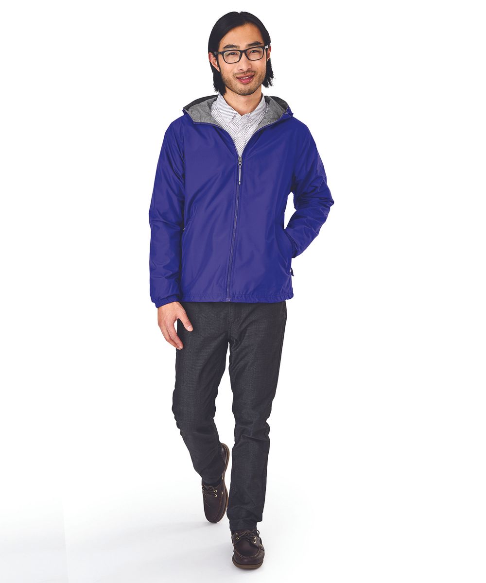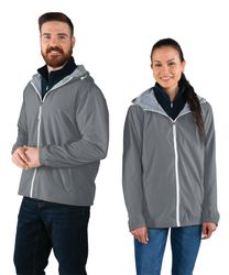 The Unisex Portsmouth Jacket is made from wind and water-resistant Softex Polyester with an oxford grey jersey lining. It features full-zip styling, reflective zipper pulls, covered side pockets, and elasticized cuffs. The hood and hem include an adjustable shockcord drawstring, and the ESA System (Embroidery Stow-Away) allows for easy decorating access. Unisex fit—women should size down 1-2 sizes for a more true-to-size fit.