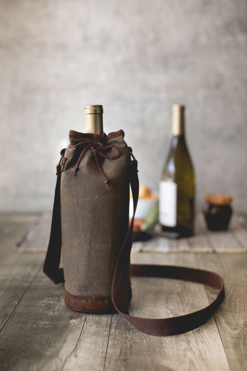 Travel across hill and dale (and even all the way across town!) with the Distressed Waxed Canvas Wine Bag, a fully insulated wine bottle carrier tote with a durable exterior and an adjustable shoulder strap. With stylish faux-suede accents and laces to keep your bottle secure, this canvas wine bottle bag will complement even the finest of vintages. This insulated wine bag is equally at home at a fine dining establishment (no corkage fee? Bonus!), a wine and cheese picnic in the park, or camping off the beaten path.