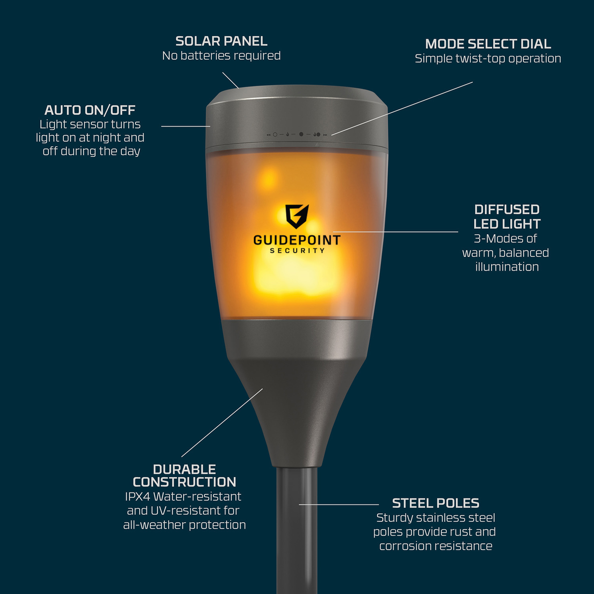 The NEBO Solar Torch was designed to mimic the attractive warm glow and flickering flame of a torch in a flame-free design that is rechargeable and solar- powered. Illuminate your landscaping by integrating it into a garden bed or use it as a path light with simple, wire-free installation. The solar-powered design includes a sensor that automatically activates the light near dusk and disables the unit to begin solar recharging during the day. Designed with an IPX4 rating for water resistance, the torch is built to perform outdoors with a max runtime of 42 hours and three light modes to customize your lighting experience. Assemble the torch in seconds with the tool-free, twist-connection steel poles and place it anywhere in your yard with a foot-assist stake system that is ultra- stable with two points of contact with the ground. Immediately transform any outdoor space with an inviting ambient glow without the risk or worry of an open flame. 1-2 color Pad print. Boxed.