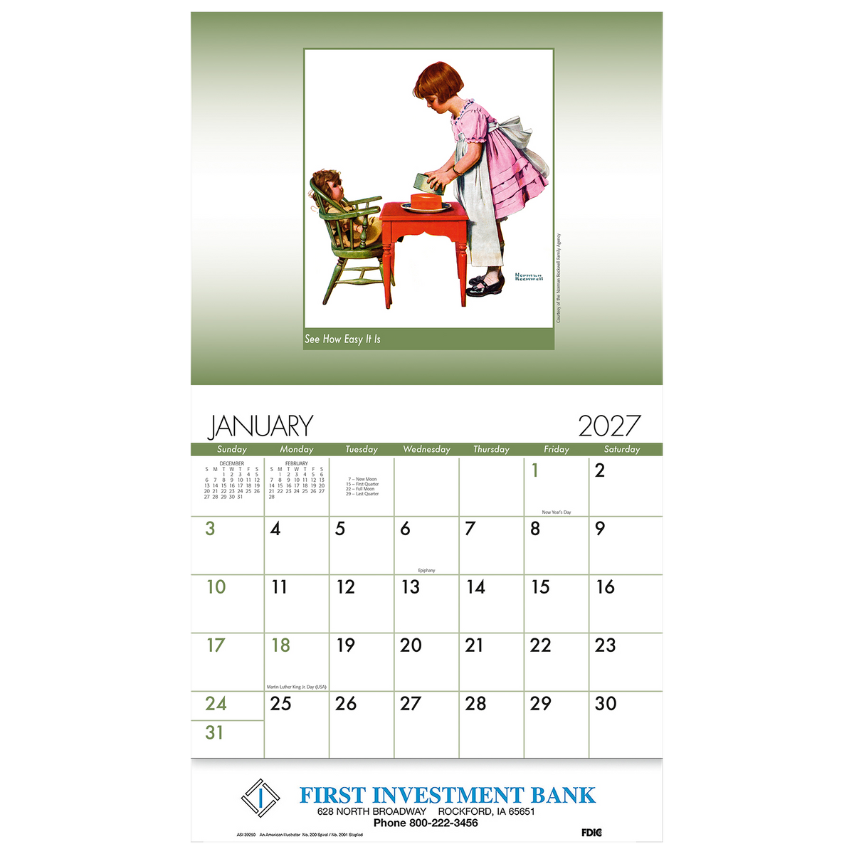 Features thirteen nostalgic art images by American icon Norman Rockwell. Calendar starts with December for early distribution. 13-month, 4-color wall appointment calendar. Great for banks, credit unions, mortgage companies, financial advisors, and more. U.S. Federal holidays and Canadian National holidays are marked. USA Made