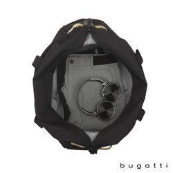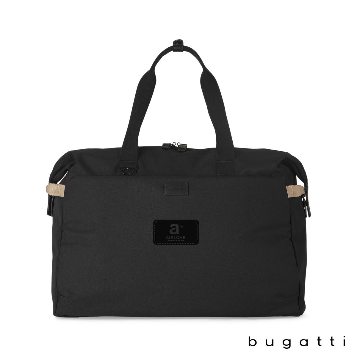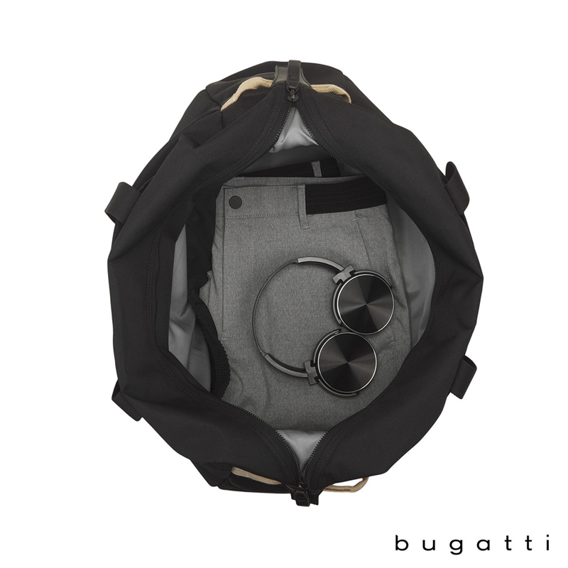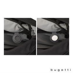 The Bugatti Vacilando Travel Duffle Bag is designed for smart, stylish travel. Made from water-repellent, recycled polyester (RPET) with a soft recycled lining, it offers both durability and sustainability. The spacious main compartment features a large RFID zippered pocket, lock-ready zipper closure, elastic organizer pockets, interior mesh side water bottle pocket, hidden AirTag™ case (AirTag™ not included), and carabiner key holder strap. The zippered front pocket is fully padded and fits laptops up to 16". Carry it with the reinforced top carry handles, removable and adjustable padded shoulder strap or grab it using the side handles. Ideal for multi-day trips, this large capacity duffel also features a trolley pass through panel, zippered rear pocket and snap-down sides for more compact loads.