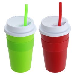 Choose a reusable travel coffee cup with added features! Bistro 14 oz Coffee Cup with Silicone Sleeve + Straw offers a comfortable grip for hot or cold beverages. Multi-functional, screw-on lid prevents spills and provides a storage compartment for the 8-3/4" reusable silicone straw. Designed to use with most standard single serve coffee makers, such as Keurig, and fits in most auto cup holders. Hand wash only. Do not microwave. BPA Free.