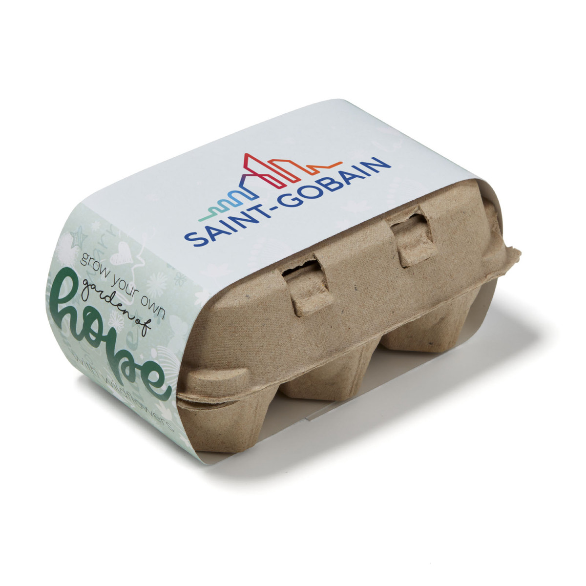 Grow-Your-Own Garden of Hope kit contains 3 packages of seeds and starter soil, plus wooden plant stakes, all inside a recycled 6 count egg carton! Write on the wooden stakes, to identify the seed type in each compartment! Use our stock design belly band and add your logo for a fantastic representation of your brand or create your own with our custom option. Seeds include: Sunflowers, Poppies, and Impatients.